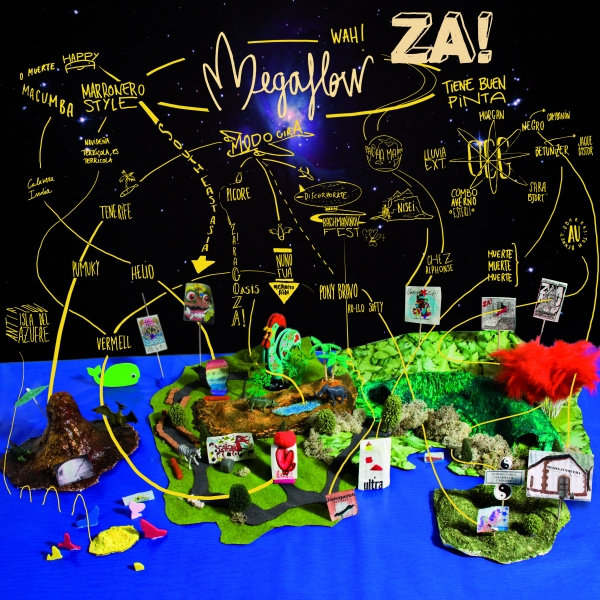 MEGAFLOW, that is subnormal energy on two vinyls with amazing artwork (each song has a miniature landscape as a map). A whirlwind of colors. Virtuosic euphoria. Living intuition. Musical explosion. Coltrane, Africa, Asia, Fugazi, Tortoise, Ruins, Stravinsky, Battles… or in this weird package just ZA!